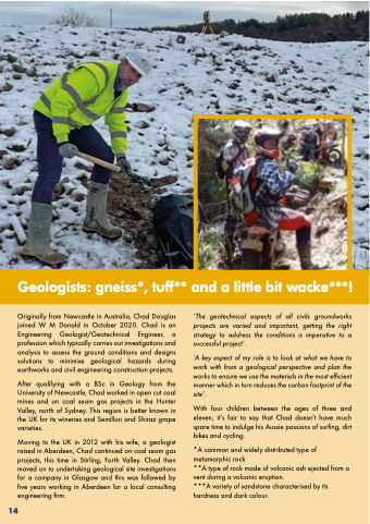 Originally from Newcastle in Australia, Chad Douglas joined W M Donald in October 2020. Chad is an Engineering Geologist/Geotechnical Engineer, a profession which typically carries out investigations and analysis to assess the ground conditions and designs solutions to minimise geological hazards during earthworks and civil engineering construction projects.