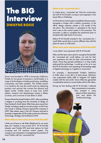 I think you’d have to ask Mike (Meldrum) for an exact date, but I believe it was around 2011. W M Donald already used Trimble GPS and total stations for land surveying and 3-D machine control systems. The company was interested in investigating the potential of what Trimble calls the ‘connected site’.