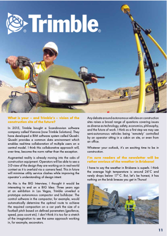 As this is the BIG Interview, I thought it would be interesting to end on a BIG Idea. Three years ago at an exhibition in Las Vegas, Trimble unveiled a prototype autonomous compactor and bulldozer. The control software in the compactor, for example, would automatically determine the optimal route to achieve the required compaction on a car park the size of a football pitch based on defined parameters (geofence, speed, pass count etc). I don’t think it is too far a stretch of the imagination to see the same approach working in, for example, excavators.