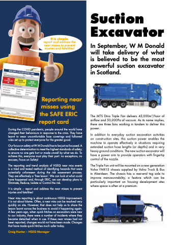 Near miss reporting is about continuous HSEQ improvement; it is not about blame. Often, a near miss can be resolved very quickly on site. However, that does not help us to share the lesson learnt across the business to avoid it happening again. A few years ago, when quick hitches on excavators were new to our industry, there were a number of incidents where they became detached when in use. If these near misses had not been reported, changes would not have been made. Changes that have made quick hitches much safer today.