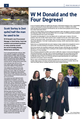 As one of Scotland’s leading civil engineering contractors, W M Donald recognises it has a responsibility to attract and develop the construction industry workforce of the future. In addition to the widely- publicised apprentices programme, W M Donald has also recruited several graduates who are starting out on their construction careers.