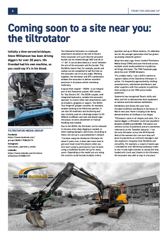 the only tiltrotator across the W M Donald fleet at the moment but I am sure they will grow in popularity as contracts managers and site engineers recognise their flexibility and versatility. For example, a couple of weeks ago I unloaded an artic delivering soakaway crates to site. It took eight minutes to unload the fully loaded artic truck and, thanks to the tiltrotator, the excavator was able to stay in one place.’