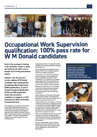 Occupational Work Supervision qualification: 100% pass rate for W M Donald candidates