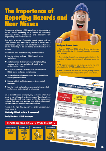 W M Donald needs all employees, no matter where they work, to report hazards and near misses. There have been many hazards and near misses within the construction industry that were not reported and which subsequently resulted in serious incidents and even fatalities.