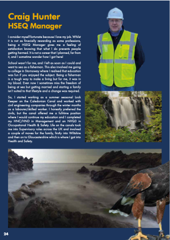 So, I started working as a summer seasonal Lock Keeper on the Caledonian Canal and worked with civil engineering companies through the winter months as a labourer/skilled worker. I honestly preferred the civils, but the canal offered me a full-time position where I would continue my education and I completed my HNC/HND in Management and an NVQ3 in Occupational Health & Safety. Life on the canals took me into Supervisory roles across the UK and involved a couple of moves for the family, firstly into Wiltshire and then on to Gloucestershire which is where I got into Health and Safety.