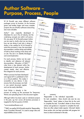 Author* was originally developed in Aberdeen for use in the oil industry, but the underlying concepts are valid in all sectors. On any given W M Donald project Author can be used to clarify what we are doing, how we are doing it and who is doing it. Author is the catalyst for W M Donald to revisit the processes it uses, the associated documentation, and the clarity and visibility